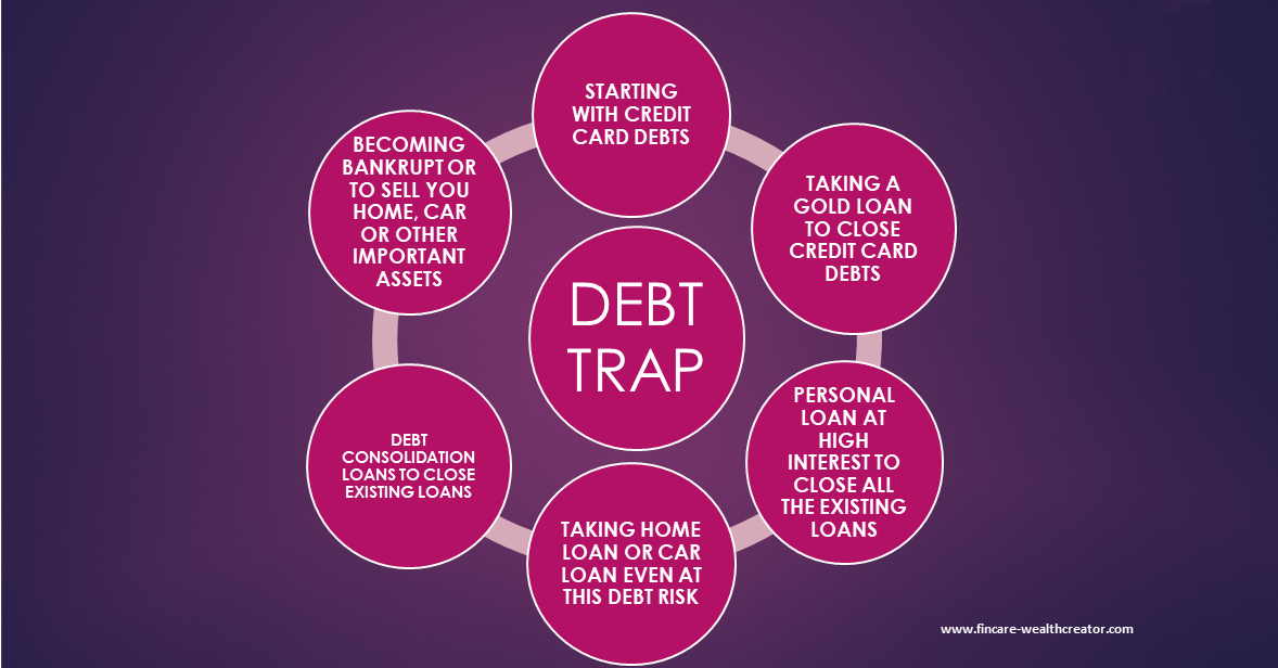 A debt trap simply works as a cycle, but the core point here is improper knowledge on debt management and improper knowledge on financial planning. The initial phase of the debt trap starts with credit cards, education loans, and gold loans. This becomes a trap when you don’t pay their installments or EMI properly.